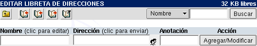 La libreta de direcciones es una pequeña base de datos para sus direcciones de contactos más comunes, que le permite acceder a ellos de una manera rápida y simple . Sin embargo, la libreta de direcciones tiene dos modos diferentes de uso: el modo de edición, que es usado para crear, eliminar y editar entradas; y el modo de uso, que le permite agregar las direcciones deseadas a los distintos campos (Destinatario, CC, CCO) de sus mensajes salientes.