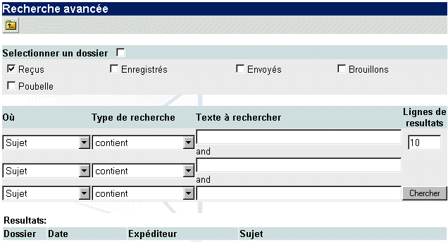 | Résultats | Affiche tous les messages correspondant aux critéres de recherche, après avoir cliqué sur le bouton "Chercher". |