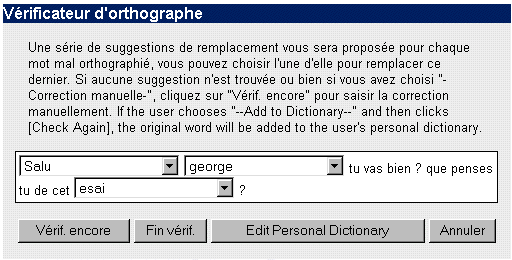 Les mots mal orthographiés dans le message sont affichés dans les menus déroulants. Pour corriger un mot, cliquez sur le menu déroulant correspondant à ce mot. Une liste de suggestions apparaît, de même que l'option -Correction manuelle-. Vous pouvez choisir un des mots proposés dans la liste, ou bien choisir -Correction manuelle-, si la solution n'est pas dans la liste. Une fois que vous avez terminé, cliquez sur "Fin vérif.". La fenêtre sera fermée, et les mots corrigés seront automatiquement remplacés. Si vous avez choisi -Correction manuelle-, cliquez sur "Vérif. encore", et vous serez en mesure de frapper dans les zones de texte qui s'afficheront là où se trouve(nt) le(s) mot(s) erroné(s). Une fois que chaque mot aura été corrigé manuellement, vous pourrez cliquer sur "Fin vérif." et vous vous retrouverez sur la page de rédaction de message, avec celui-ci corrigé. |