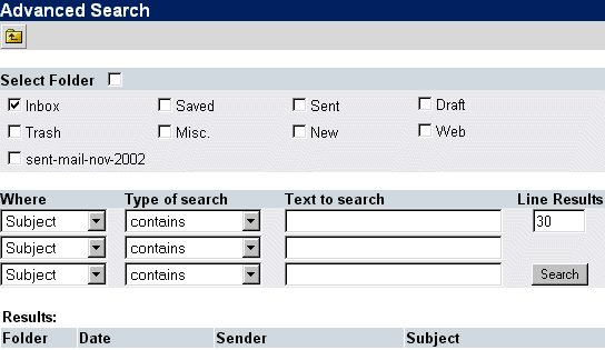 Below, is what you will see on the Advanced Search page.  It allows you to perform more specific searches in your mailboxes than the Search Toolbar .  You can navigate to the advanced search page by clicking the Search Button ( ) on the Main Toolbar .