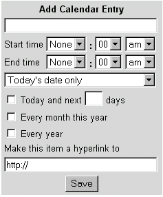 Para adicionar uma entrada, digite seu memorando na caixa de texto, abaixo da frase "Adicionar à Agenda". Selecione em seguida o horário do evento, escolha a hora de início e a hora final do evento. Você pode também selecionar o período que este evento irá permanecer ativo, todos os dias, todos meses, etc. Se você não selecionar "nenhum período" , o evento estará adicionado ao final da lista diária, em nenhuma hora particular. Você pode usar desta forma quando sabe que o evento será no dia determinado, porém não se sabe o horário. Se você não selecionar "horário final", o evento simplesmente não indicará o horário de seu término.