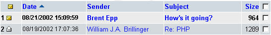 第一列表示该封邮件的“状态”,金色且封口的信封表示该邮件尚未被读取,同时该行中的所有文字也应该是粗体。图中白色且开口的信封表示该邮件已经被读取过了,同时该行中的所有文字也应该会是一般字体(不是粗体)。点击你想要改变读取状态的邮件信封,你可以改变该封邮件的状态。假如是已经被读取过的,它会变成未读取的状态。