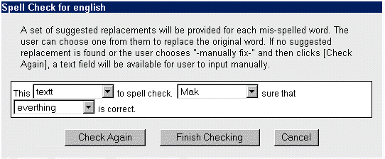 你在本文框里要撰写邮件。一旦你已经完成你的邮件了,你可能想要确认有没有拼写错误。不管怎样,经常这样做,是很令人厌烦的。很幸运地,OpenWebMail内建了相当不错的拼写检查功能。只要选择你想要使用的字典(English,or American),然后点击“拼写检查”。这样就会开启新的窗口执行拼写检查。