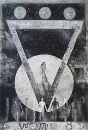26” x 20”. One of drawing series “Connections.” Graphite, conté, gouache, charcoal, watercolour pencil, India ink and acrylic on Rives BFK paper, attached to wood panel. 2014. $600.00