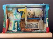 28.75"x17.75"x7.25" Mixed media assemblage on interior and exterior of wine crate--circa 1950. 2000.