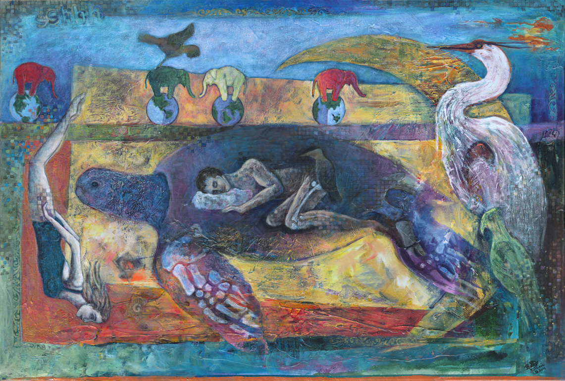 16"x20". Acrylic, mixed media, and India ink monotypes on rice paper collaged on canvas. 2011.