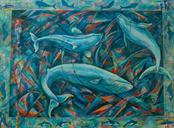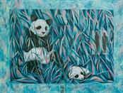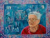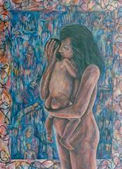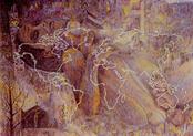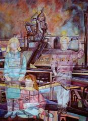 19"x35" Acrylic, watercolor pencil and watercolor on acid free mat-board. 1990.